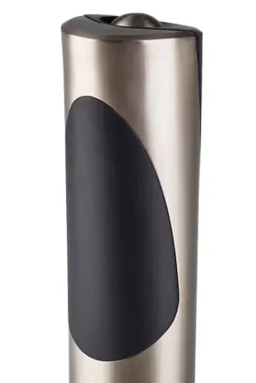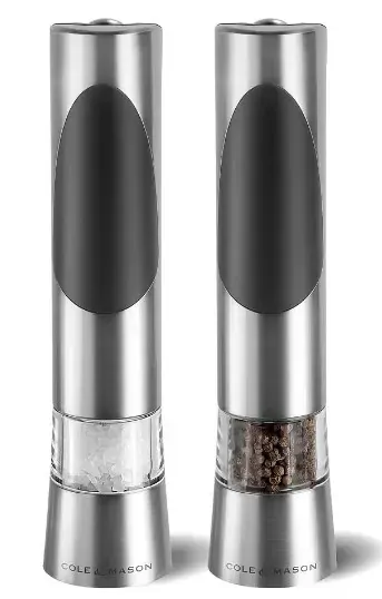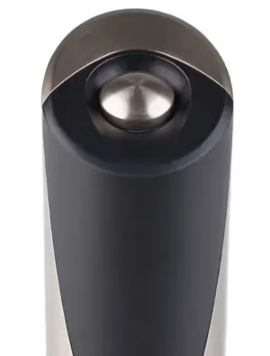 - A sleek and stylish electronic mill set with a brushed chrome and black finish. Operated by a button on top making them easy to use single handedly.