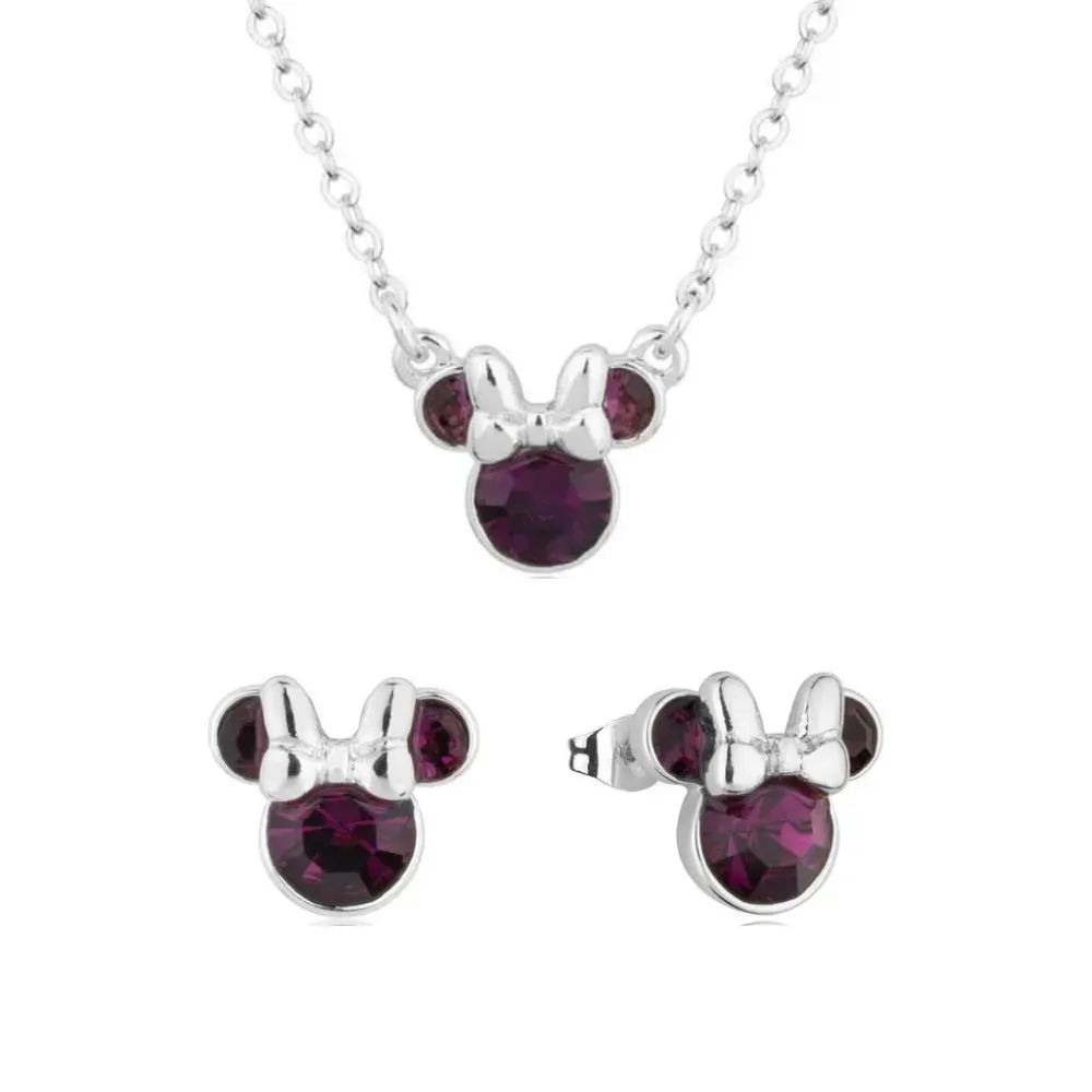 Disney Couture Kingdom February Birthstone Minnie Necklace & Earrings Bundle Silver