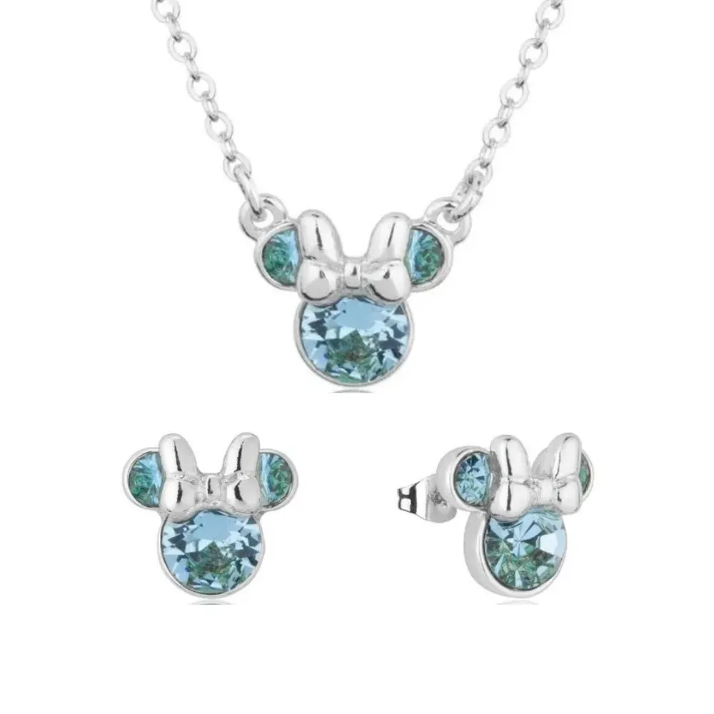 Disney Couture Kingdom March Birthstone Minnie Necklace & Earrings Bundle Silver