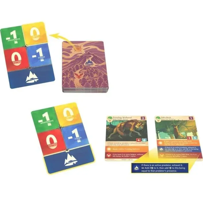 An individual game session is played in rounds, and those rounds consist of turns. On your turn, you perform one action: either play a card from your hand, or choose an action from a card on the table. Each action allows you to interact thematically and narratively with the world, and each time you take an action, the world comes to life around you. Predators stalk their prey, rain pours from the sky, rocks tumble down the mountain to block your path, and much more.