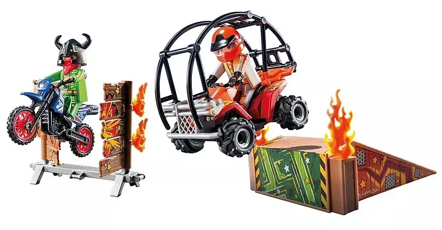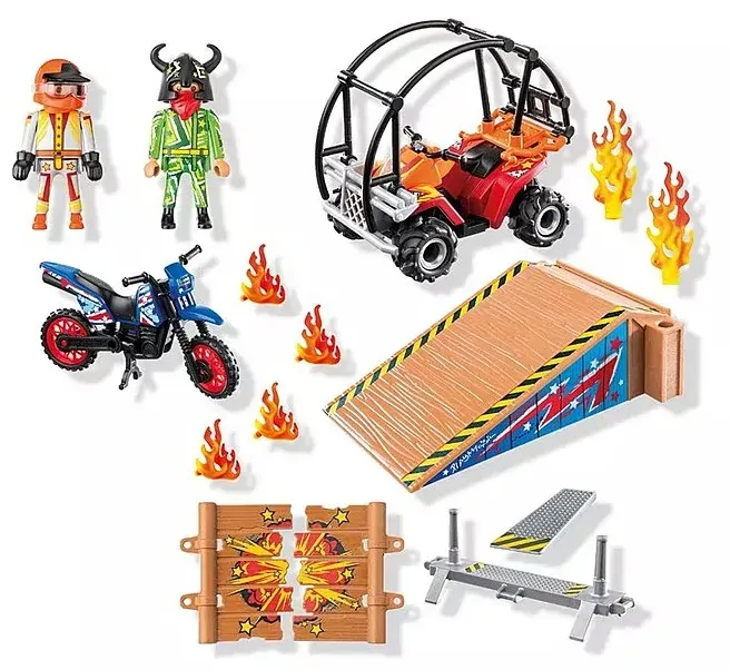 Get ready for action-packed entertainment! The large jump ramp promises exciting stunts and thrilling moments. The motorcyclist dares to jump through the swinging wooden plank or boldly flies through blazing flames. Meanwhile, the quad biker showcases spectacular tricks on the high ramp, ready for daring maneuvers. With this thrilling setting, the PLAYMOBIL Stunt Show is perfect for fans of action and adrenaline.