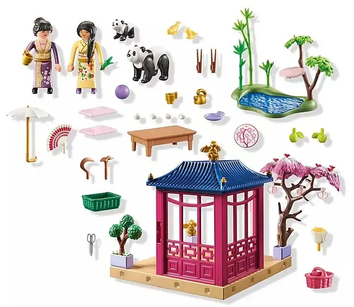 Set includes 2 women, 1 panda, 1 panda baby, 2 birds, 1 open building, 1 pond area, 3 bamboo plants, 1 branch with foliage and platform, 1 ball, 2 apples, 1 cherry tree with blossoms and 3 lanterns, 1 bonsai, 1 fan, 1 umbrella, 1 basket, 1 feed, 1 plant, 2 flower boxes, 1 box, 2 gardening tools, 1 scissors, 1 table, 2 cushions, 2 cups, 1 teapot, 2 chopsticks, 1 plate, 4 sweets, 2 dragon figures.