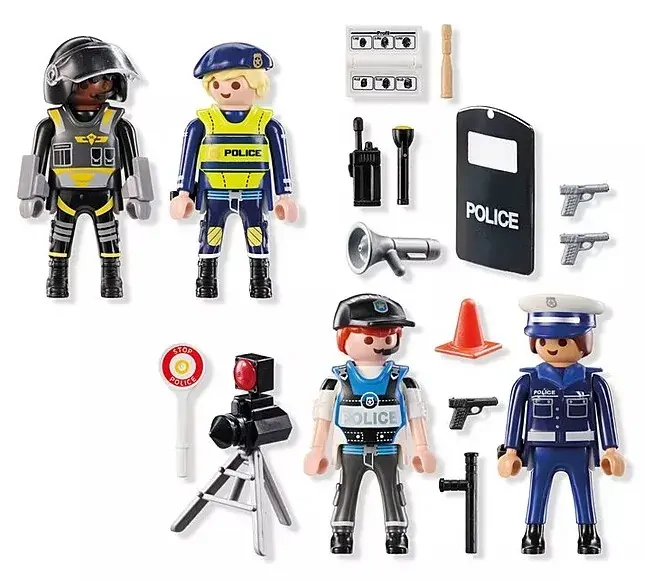 Set includes 1 man with police helmet, 2 men with police cap, 1 woman with police cap, 3 holsters with pistols, 1 police shield, 1 police multi-purpose baton, 1 SEK protective vest, 1 police trowel, 1 mobile radio telephone, 1 mobile radar flasher, 1 police vest, 1 paint box with brush, 1 flashlight, 1 megaphone.