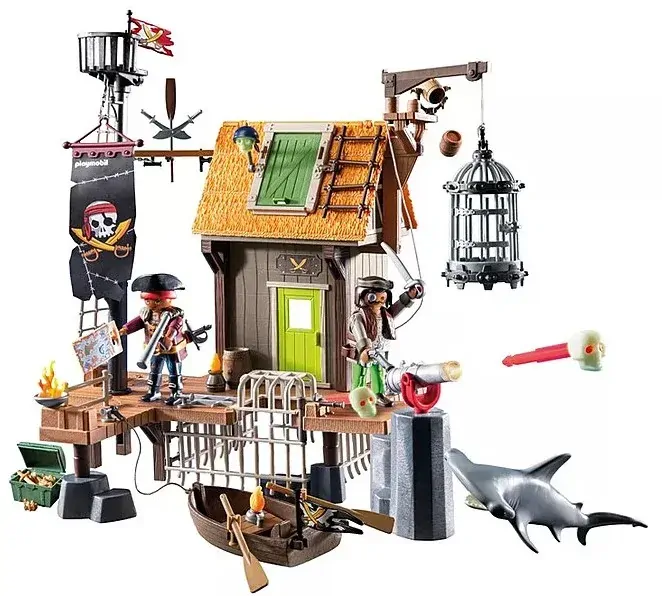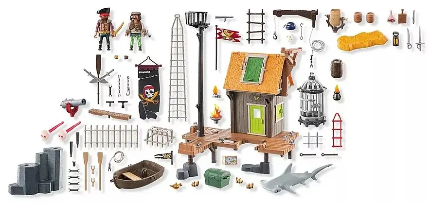 Set includes 2 pirates, 1 hammerhead shark, 2 flags, 1 flagpole, 1 mast with stork's nest, 1 banner, 1 chain, 1 shroud, 2 wooden planks, 3 oars, 2 double sabers, 2 adapters, 1 house, 1 door, 2 windows, 8 timber posts, 1 roof, 1 skull, 2 headscarves, 1 ladder, 1 crane boom, 2 ropes, 1 cage, 3 barrels, 1 barrel holder, 1 pier, 1 hatch, 5 grids, 1 cage top grid, 3 rocks, 2 tree connectors, 6 bollards, 1 fence, 1 collapsing pier, 1 fire bowl with fire, 1 cannon, 1 cannon holder, 2 skull projectiles, 1 boat, 1 bench, 1 boat, 2 oar holders, 1 map, 1 hat, 1 binoculars, 2 sabers, 2 arm cuffs, 1 pistol, 1 rope ladder, 1 chest, 1 lamp, 1 knife, 1 cutting board, 1 ham, 1 straw bedding, 1 lamp with fire, 4 break-through boards, 2 torch holders, 2 adapter crossbars, 2 bolts, 3 adapters, 1 clip, 1 hook, 4 handle adapters.