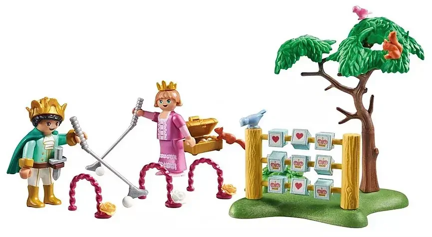 Set includes 1 girl, 1 boy, 2 squirrels, 2 birds, 1 crown, 1 cloak, 1 sword, 1 small crown, 2 mini golf clubs, 4 balls, 1 treasure chest, 3 gates with rose blossoms, 1 green plate, 1 tree trunk, 2 tree crowns, 1 green plant with blossoms, 1 wooden frame, 9 dice.