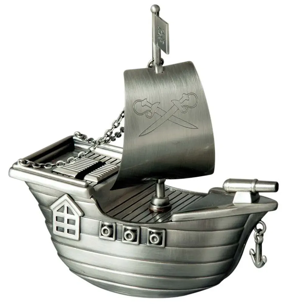 Russell Collection Money Bank - Pewter Finish Jolly Roger Pirate Ship